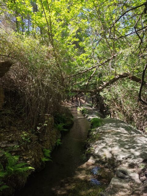 Acequia histórica que conduce el agua de Sierra Nevada hacia cultivos.