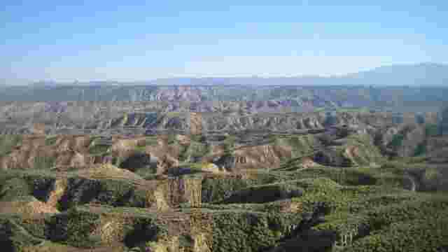 Paisaje de badlands rojizos modelado por la erosión en el Geoparque de Granada.