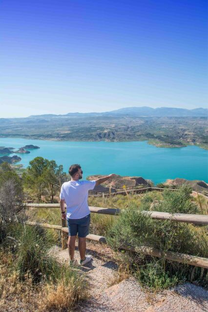 Paisaje acarcavado de origen marino en la cerrada del Negratín, donde chimeneas de hadas y badlands rojizos contrastan con las aguas turquesa del embalse.